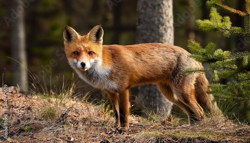 © netsay, Obraz premium Vibrant Red Fox Roaming Through an Enchanted Forest, Dappled Sunlight Creating Dramatic Contrasts, Natures Mysterious Majesty on Full Display.