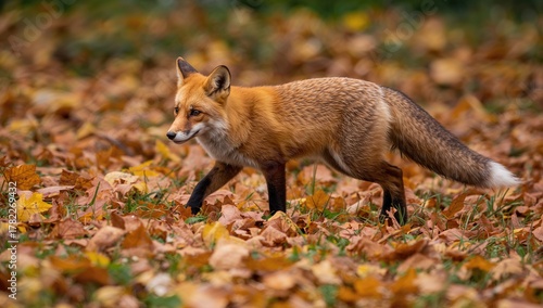 Obraz premium Vibrant Red Fox Vulpes vulpes navigating through autumn foliage, showcasing...