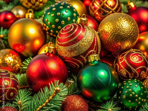 © Man888, Naklejka premium Vibrant Red Gold and Green Christmas Decorations Creating a Festive Holiday Atmosphere and Spirit