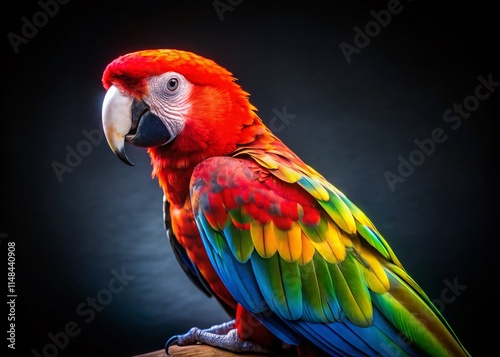 © prapatsorn, Naklejka premium Vibrant Red-Headed Parrot, Colorful Bird, Candid Photography, Black Background, Exotic Bird Photo
