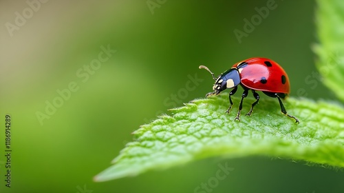 © Generative AI, Fototapeta premium Vibrant Red Ladybug on Green Leaf in Natural Outdoor Setting : Generative AI