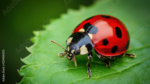 © ศิริพร มีพัฒน์, Naklejka premium Vibrant Red Ladybug Resting on Green Leaf with Detailed Focus on its Colorful Spots and Texture, Capturing Nature's Beauty in Close-Up Photography
