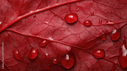 © Freshpixel, Fototapeta premium Vibrant red leaf adorned with glistening water droplets enhances the natural elegance of its veins, signifying vitality, freshness, and the beauty of nature's elements.