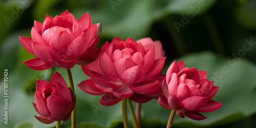 © 29 December, Obraz premium Vibrant red lotus flowers blooming against a green backdrop.