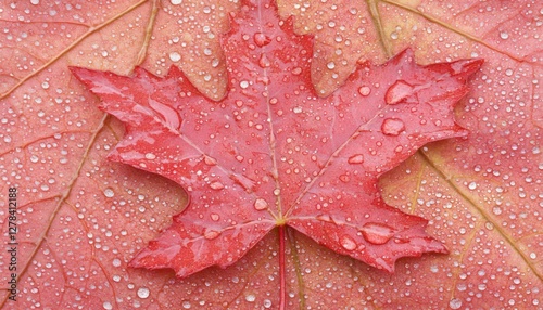 © Yopi, Fototapeta premium Vibrant Red Maple Leaf with Dew Drops on Autumn Leaves