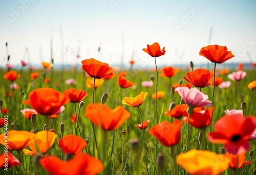 Fototapeta premium Vibrant red, orange, and pink poppies bloom in a sun-drenched Lancaster...