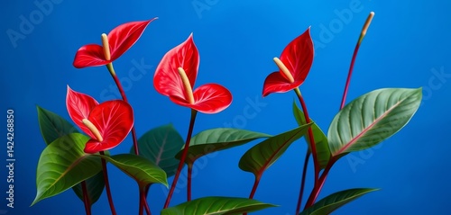 © DITSARAPHAN, Obraz premium Vibrant red-painted anthurium blooms against a deep blue backdrop, bold, vibrant