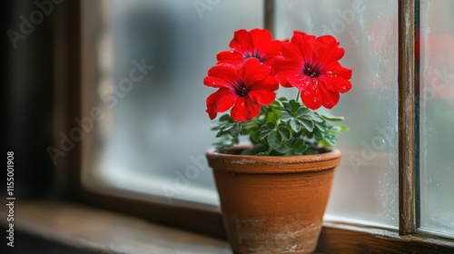 © Artittaya, Fototapeta premium Vibrant Red Petunias in a Rustic Terracotta Pot by a Window
