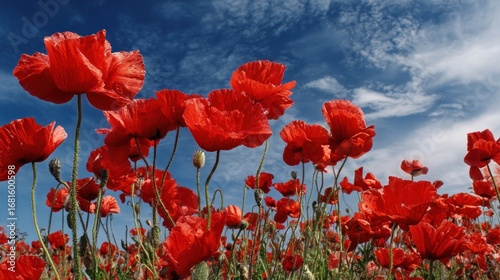 © Anum, Naklejka premium Vibrant red poppies against a blue sky