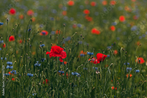 © Cavan, Fototapeta premium Vibrant Red Poppies and Blue Wildflowers in a Summer Meadow