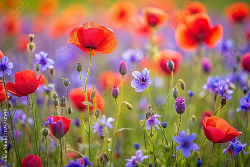 © setan cell, Fototapeta premium Vibrant red poppies and blue wildflowers in a sunlit field.