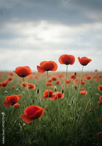 © Jani, Obraz premium Vibrant Red Poppies Bloom in a Field Under a Moody Sky.