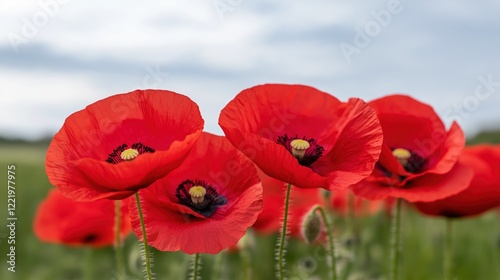 © ArtVessel, Obraz premium Vibrant red poppies blooming in a green field under a cloudy sky