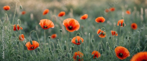 Fototapeta premium Vibrant Red Poppies Blooming In A Lush Meadow With Ample Space For Text...