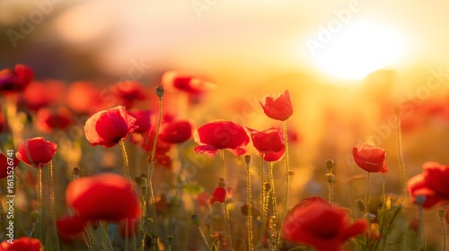 © zhongyou, Fototapeta premium Vibrant red poppies glowing under the golden light of a sunset.