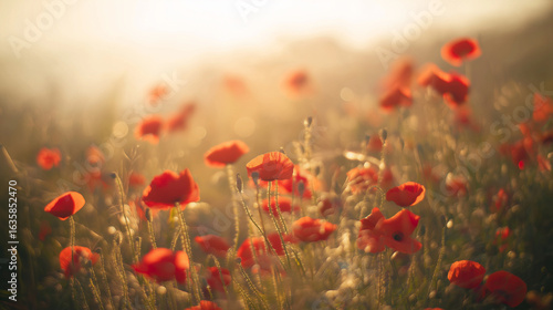 © 艺橙 张, Fototapeta premium Vibrant red poppies glowing under the golden light of a sunset.