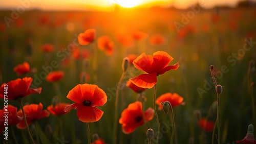 © EIKOZ, Fototapeta premium Vibrant red poppies glowing under the golden light of a sunset.