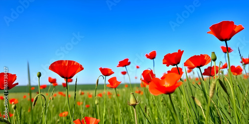 Obraz premium Vibrant red poppies, green field, blue sky, sunny day, close-up flowers, meadow landscape, wildflowers, nature photography, high contrast, vivid colors, summer scene, floral beauty, shallow depth