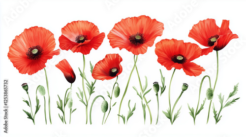 Fototapeta premium Vibrant red poppies illustration in watercolor style, isolated on a white background