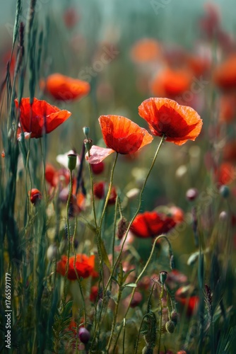 © art, Fototapeta premium Vibrant red poppies in a field of green grass