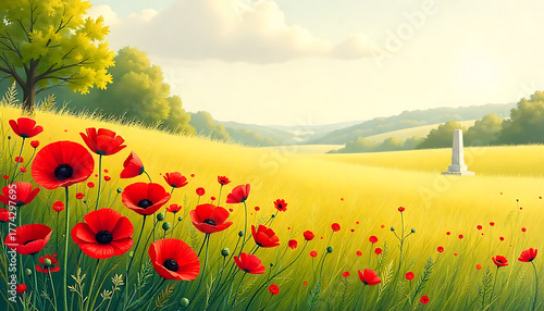 Fototapeta premium Vibrant red poppies in a golden field with a distant monument under a sunny...