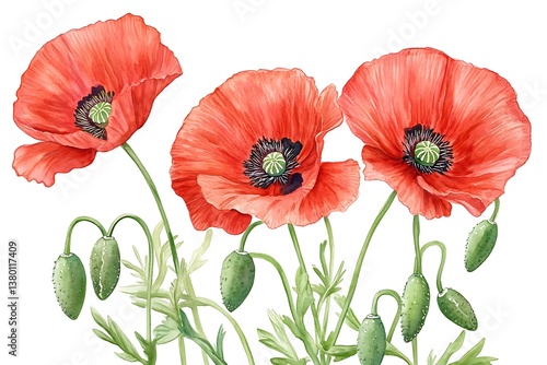 © Emongrapic, Obraz premium Vibrant Red Poppies – Realistic Watercolor Botanical Illustration