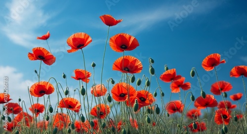 © Earl, Obraz premium Vibrant red poppies swaying in gentle spring breeze under blue sky