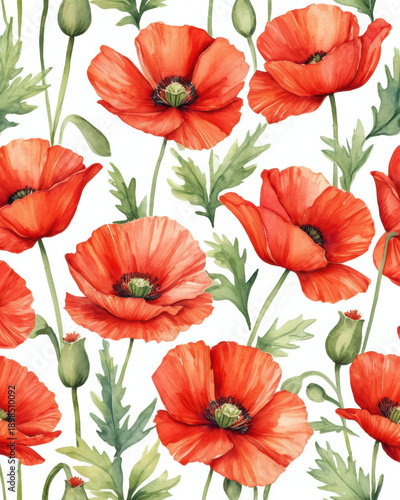 © tonstock, Fototapeta premium Vibrant red poppy blossoms create a seamless watercolor floral pattern with green leaves on a white background.