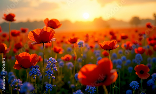 © Sofia, Fototapeta premium Vibrant red poppy field at sunset with soft blue wildflowers.