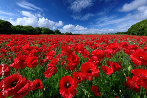 © YouraPechkin, Obraz premium Vibrant red poppy field under a clear blue sky during sunny daylight hours