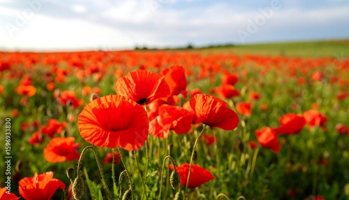 Fototapeta premium Vibrant red poppy field under a partly cloudy sky