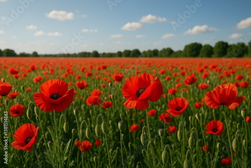 Obraz premium Vibrant Red Poppy Field Under Blue Sky With Fluffy Clouds on Sunny Day