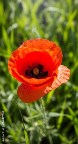 Fototapeta premium Vibrant Red Poppy Flower Blooming in Summer Field with Soft Green Background
