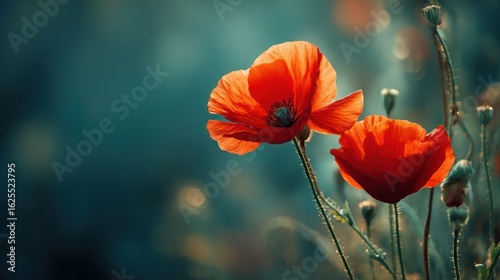 Fototapeta premium Vibrant red poppy flowers bloom in a serene field, bathed in soft, bokeh...