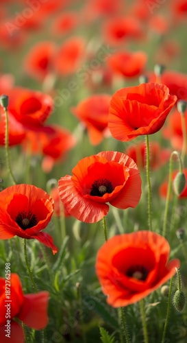 © Permen, Fototapeta premium Vibrant red poppy flowers blooming in a field under natural sunlight