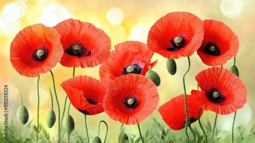 © Cyber Shutter, Obraz premium Vibrant red poppy flowers blossoming in a sunlit field during golden hour showcasing nature's beauty and tranquility