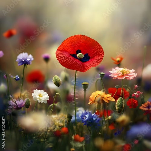 Obraz premium Vibrant Red Poppy in Summer Wildflower Meadow