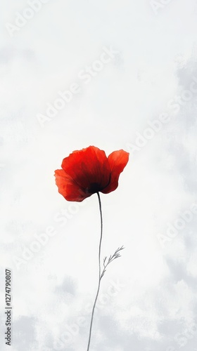 © RizArt, Obraz premium Vibrant red poppy stands tall against a soft cloudy sky