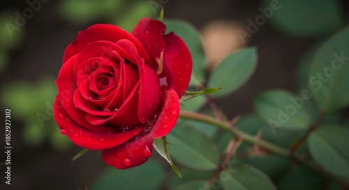 © Tamim, Naklejka premium Vibrant Red Rose Blooming with Dewdrops, Close-Up Floral Photography, Romantic Valentine's Day Symbol, Macro Shot, Soft Lighting, High Resolution
