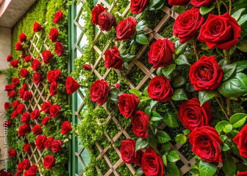© Arnada, Obraz premium Vibrant Red Rose & Green Foliage Wall Display with Elegant Cut-Outs - Soft Natural Light