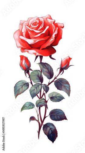 © Alex, Obraz premium Vibrant Red Rose with Buds and Leaves Illustration