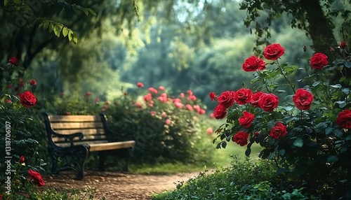 Obraz premium Vibrant red roses blooming in a serene park setting with a rustic bench surrounded by lush greenery and softly blurred background. ,