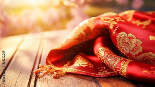 Fototapeta premium Vibrant red silk scarf with golden embroidery symbolizes youth and hope, set against blooming cherry blossoms.