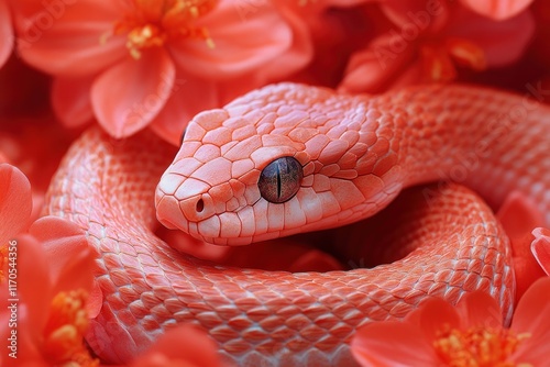 © zhuan, Fototapeta premium Vibrant Red Snake Sculpture Among Bright Red Flowers, Artistic and Lively Decoration for 2025, Captivating and Unique