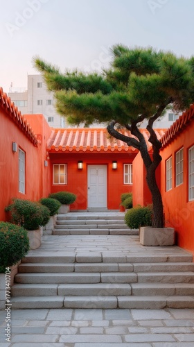 © Azkya, Fototapeta premium Vibrant Red Traditional Building Courtyard With Stone Steps Green Tree and White Door Under Soft Daylight