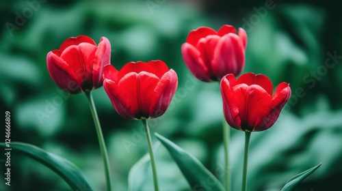 © Sam-th, Obraz premium Vibrant Red Tulips Blooming Among Lush Green Foliage