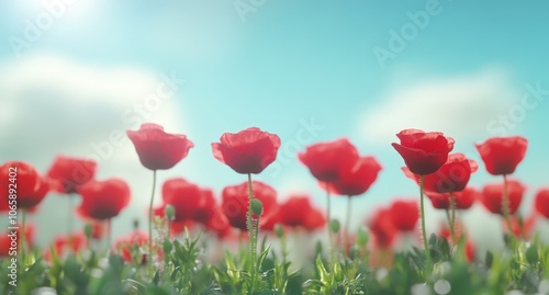 © Ishika, Obraz premium Vibrant red tulips blooming in a field against a serene blue sky