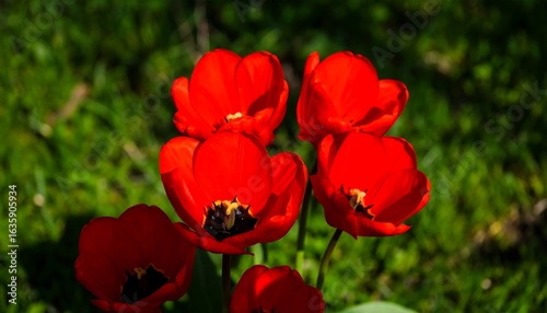 © Jaya, Fototapeta premium Vibrant red tulips in a grassy meadow
