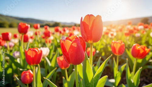 © Ksenia Pestereva, Obraz premium Vibrant red tulips swaying in the breeze on sunny afternoon, serenity