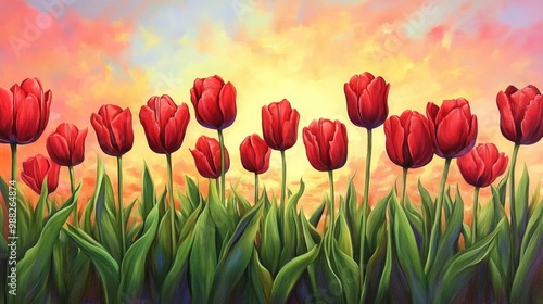 Fototapeta premium Vibrant Red Tulips with Lush Green Foliage Beneath a Glowing Sunset Sky